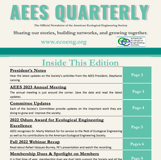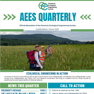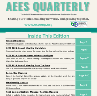 The AEES Quarterly contains Society News, providing updates about the Business Meeting, Committee progress, upcoming events; member spotlights - where members can share their successes in ecological engineering or discuss what’s important to them; and career opportunities, where members can “post” open positions and sources for funding that they wish to share with other members.